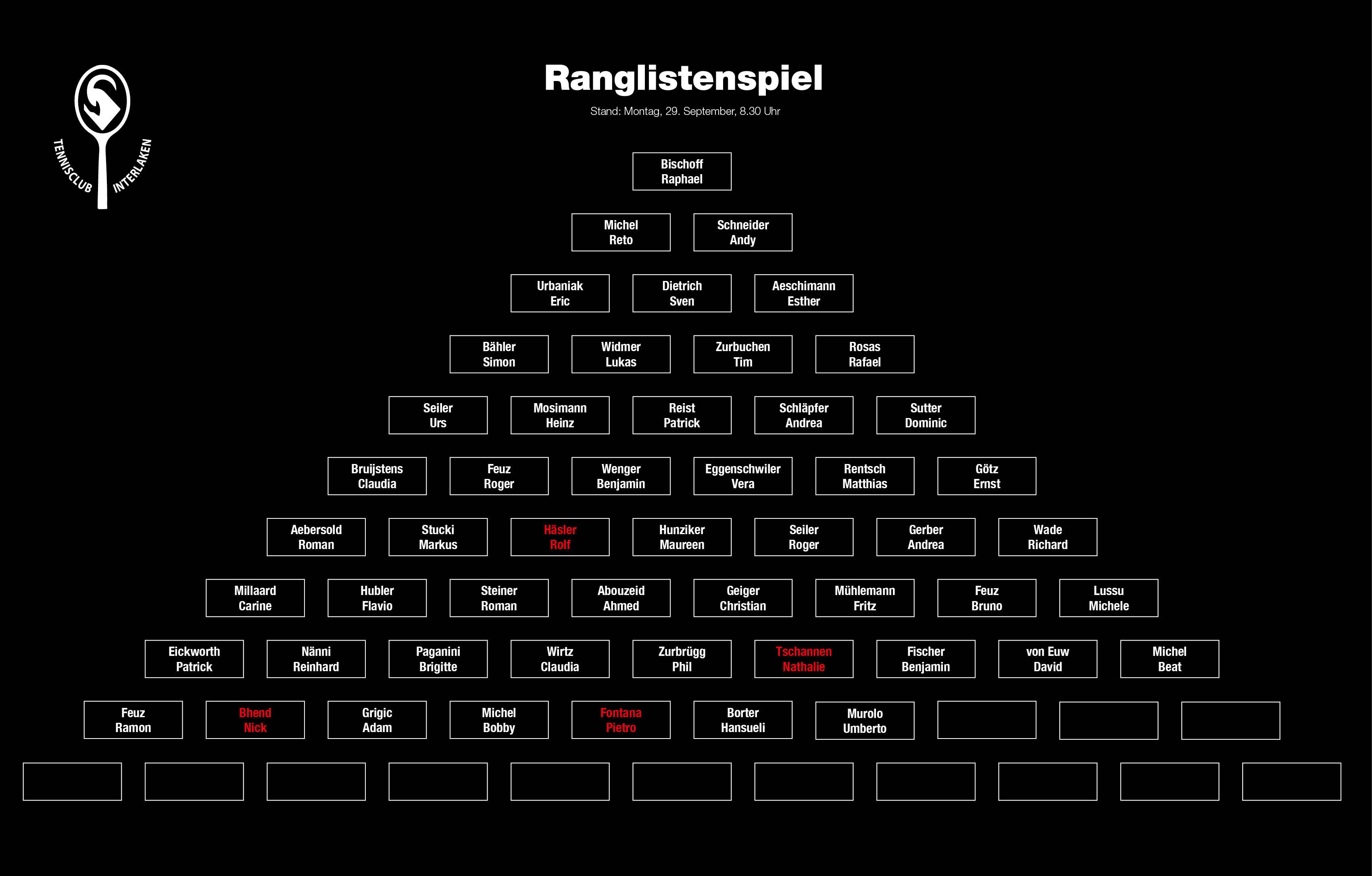 Wie immer: rot markierte Namen sind in den Ferien, verletzt oder sonst abwesend und somit nicht zum Fordern geeignet. Bitte meldet uns längere Abwesenheiten! SpielerInnen, die mehr als 3 Wochen verletzungs- oder ferienbedingt fehlen, werden ans Ende der Pyramide gesetzt. So werden die Pyramidenplätze nicht mehrere Wochen besetzt.